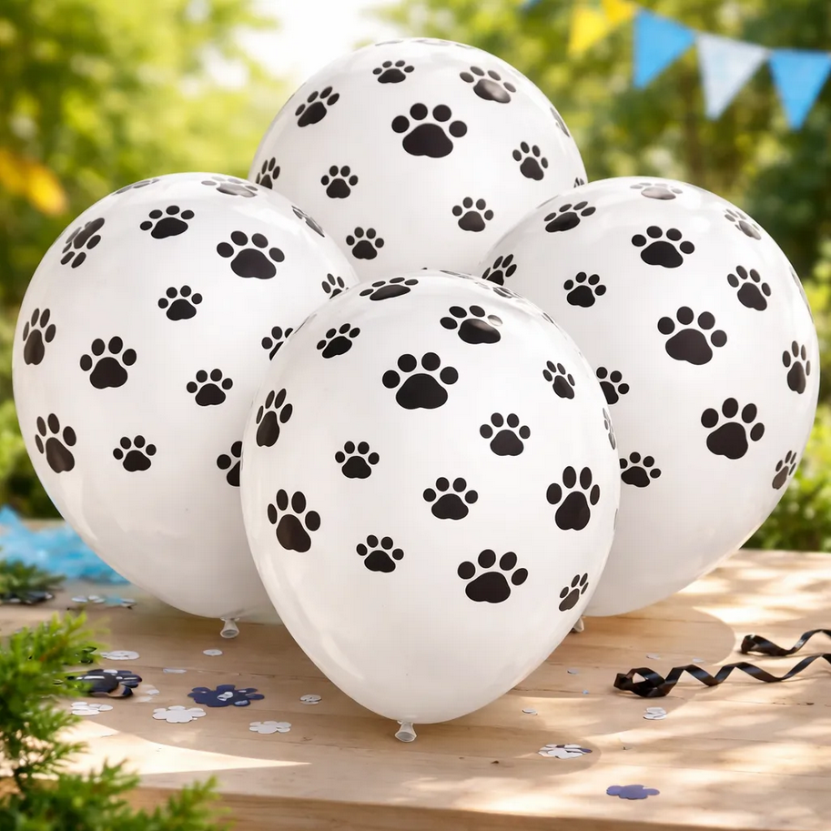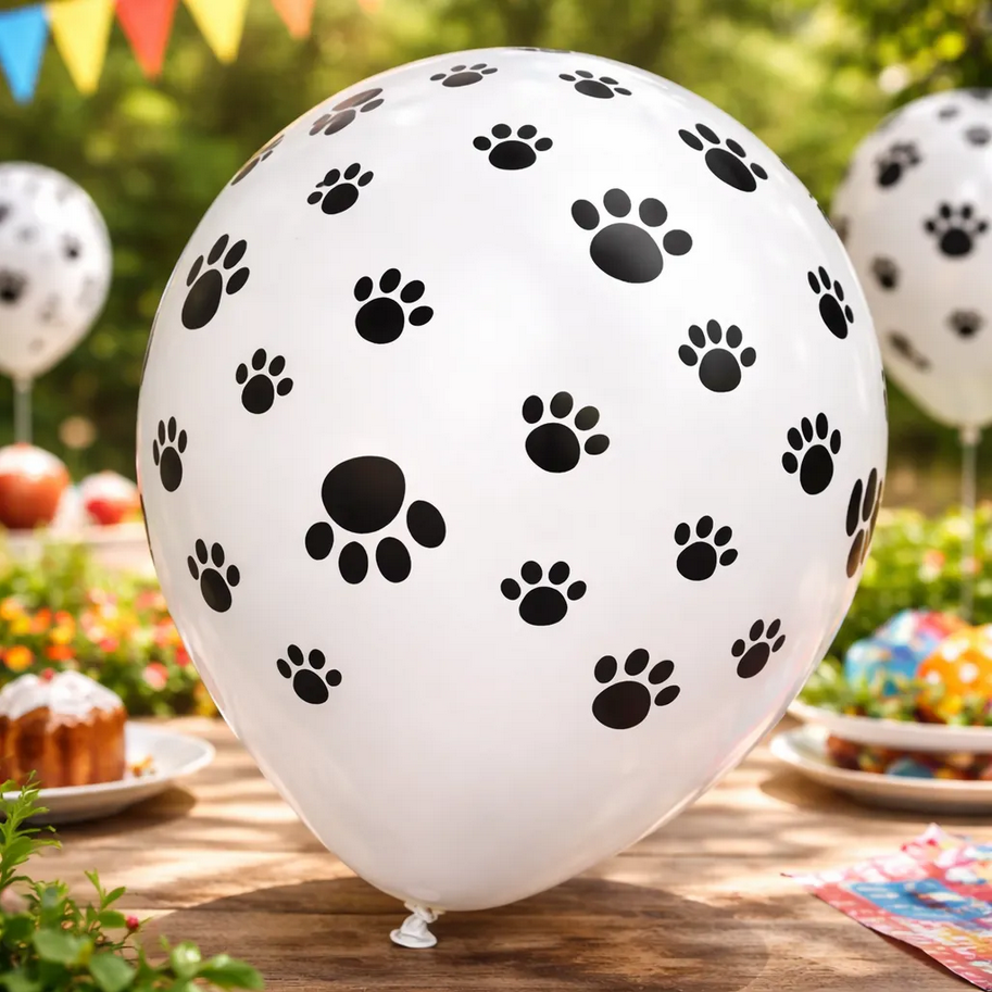 Globos con diseño de huellitas tipo Patrulla Canina, ideales para fiestas infantiles y temáticas.