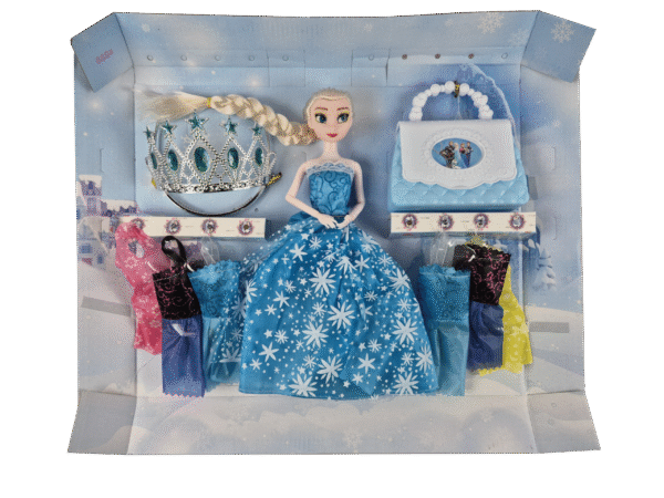 Set de Frozen muñeca, corona, cartera y 6 vestidos